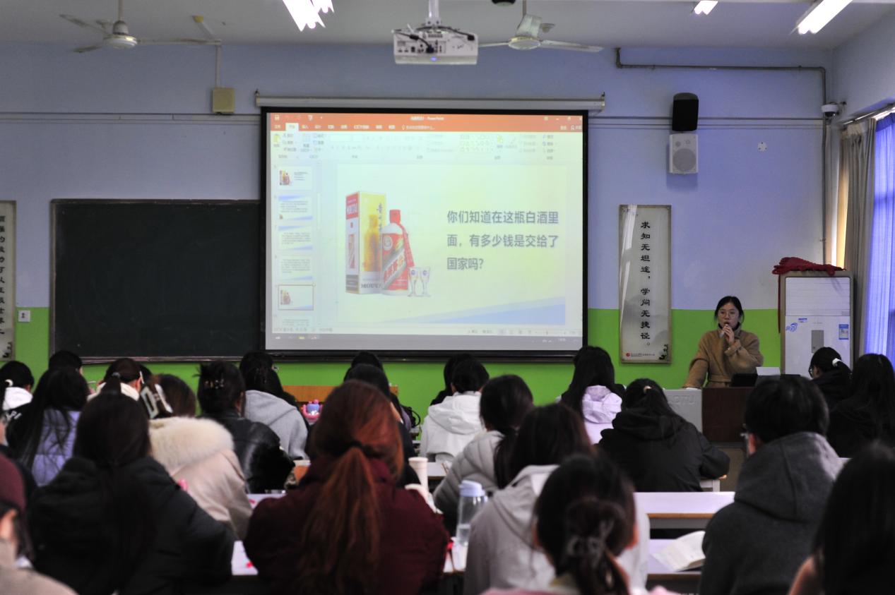 在核心知识讲授环节,郝老师以一瓶500ml、出厂价969元的茅台酒为例,现场计算出其应缴纳的从价税193.8元与从量税0.5元,清晰呈现了194.3元消费税如何纳入零售价并由消费者承担的机制。她进一步阐释,这些税款最终汇入国家财政,成为国防、基建、社保、教育等公共服务的财力支撑,使“取之于民、用之于民”的理念变得具体可感。