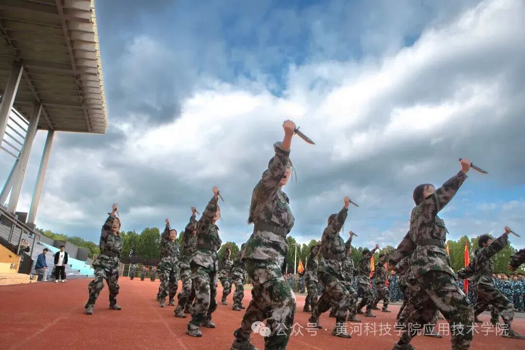 助教方阵带来了精彩的匕首操表演。他们利刃出鞘,弓步、闪身、转身一气呵成,擐甲挥戈间杀声震天,尽显巾帼英雄的飒爽英姿与无畏血性。
