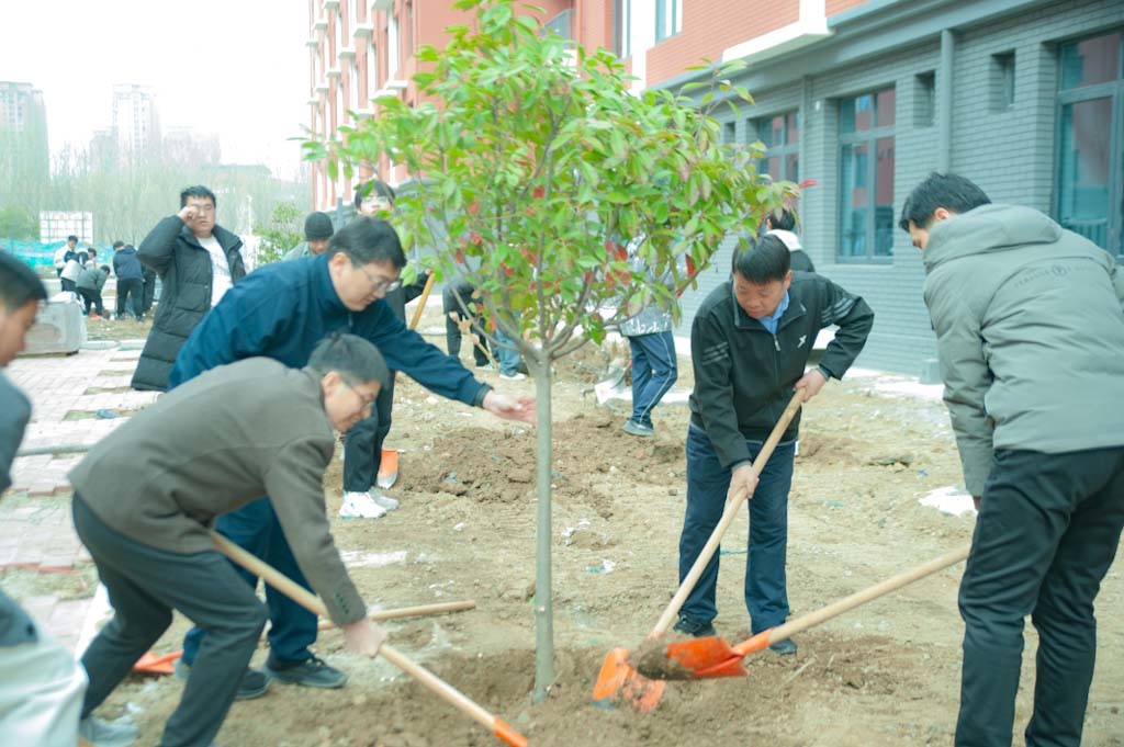 活动现场,在公司党委领导下,青年教师党员与员工干部青年结对协作,挥锹铲土、扶苗培土、提水浇灌,共同完成树苗栽种。