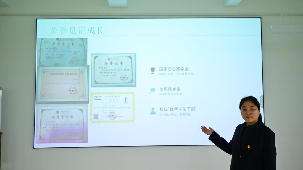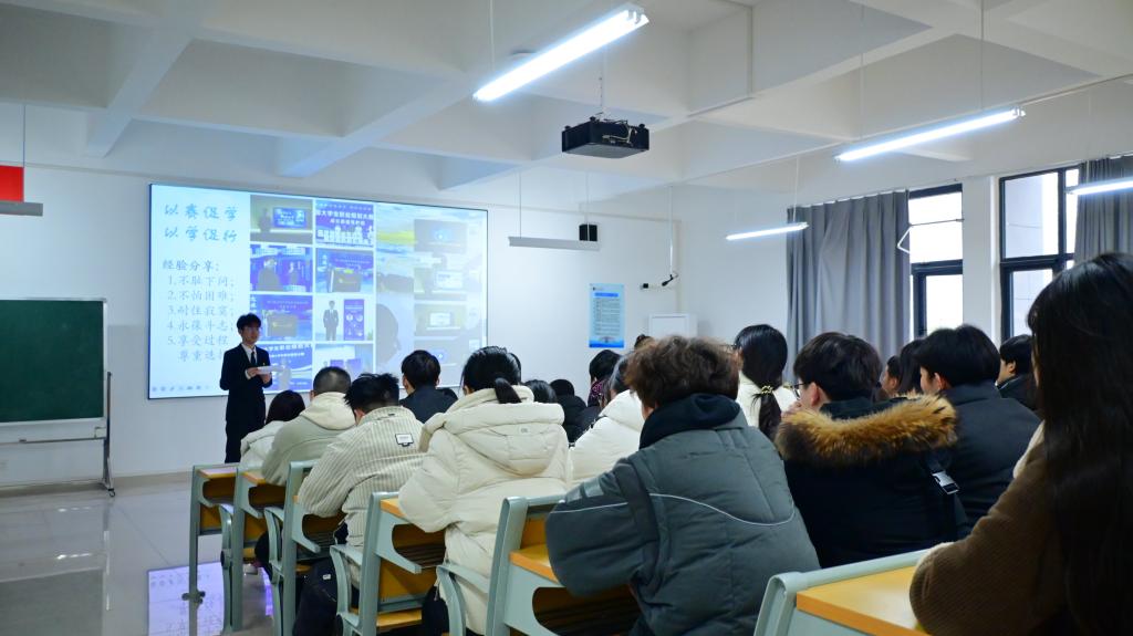 竞赛模范代表郭思辰结合备赛经历,分享了攻坚克难的五点感悟,讲述了兼顾学业与备赛、反复打磨作品,最终斩获省级铜奖等荣誉的历程,诠释了“以赛促学、以学促行”的奋斗精神。
