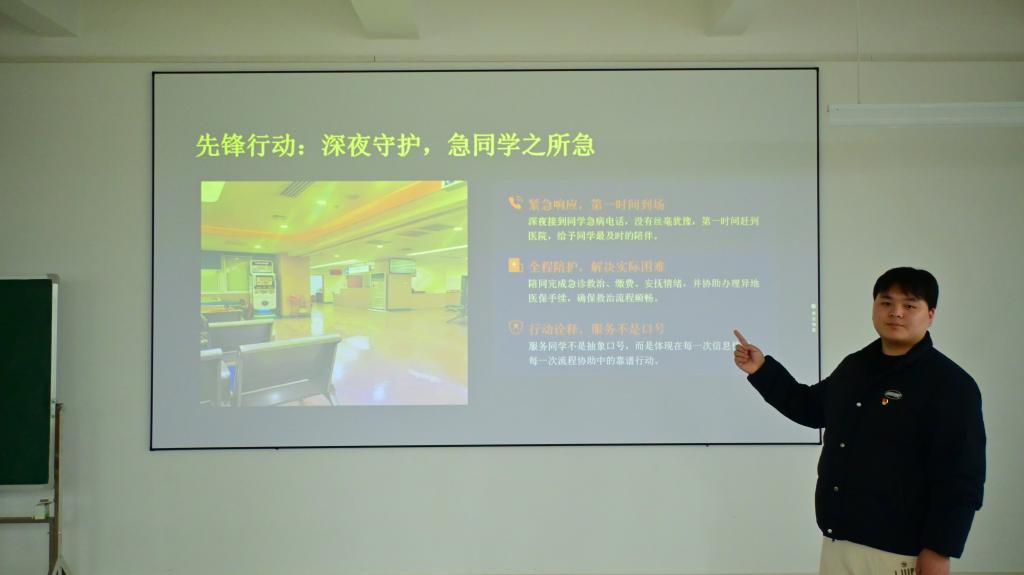 员工干部模范代表杨紫冲分享了“少喊口号,多办实事”的工作理念,他将服务同学落到实处,在陪护同学、协调诉求、规范管理等小事中践行党员初心,赢得师生信任。